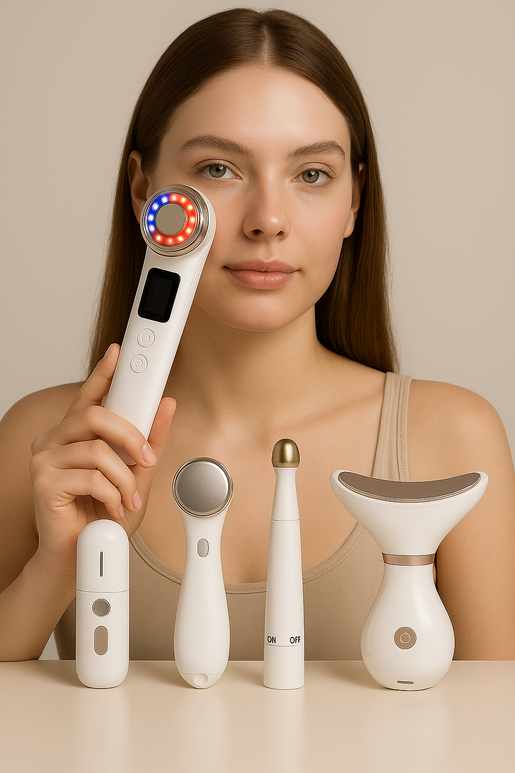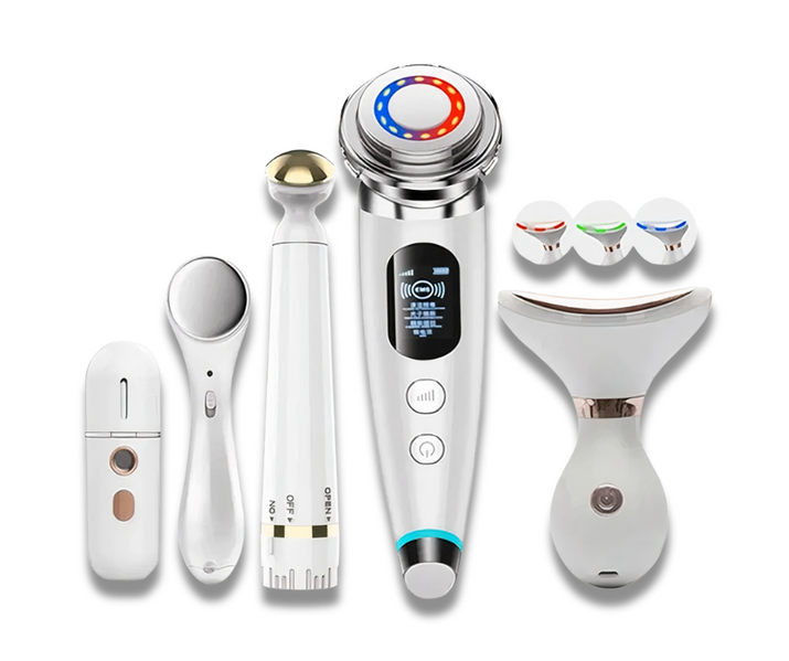 This beauty kit offers a variety of treatments including deep vibration cleansing, photon rejuvenation with red and blue light for skin lifting, and a micro-current tool that combines light therapy with soothing warmth for superior skincare results.